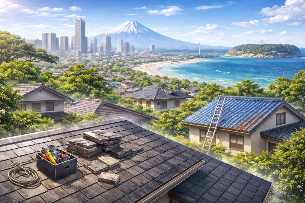 神奈川県(横浜・川崎・湘南・三浦半島・県央・県西)で屋根修理を検討中の方向けに、 相場の目安/工法の選び方/見積もりの読み解き方/助成制度や火災保険/“神奈川ならでは”の注意点を1ページで整理しました。 結論は「原因特定(写真つき)→ 同条件で3社相見積もり → 保証の書面化」です。